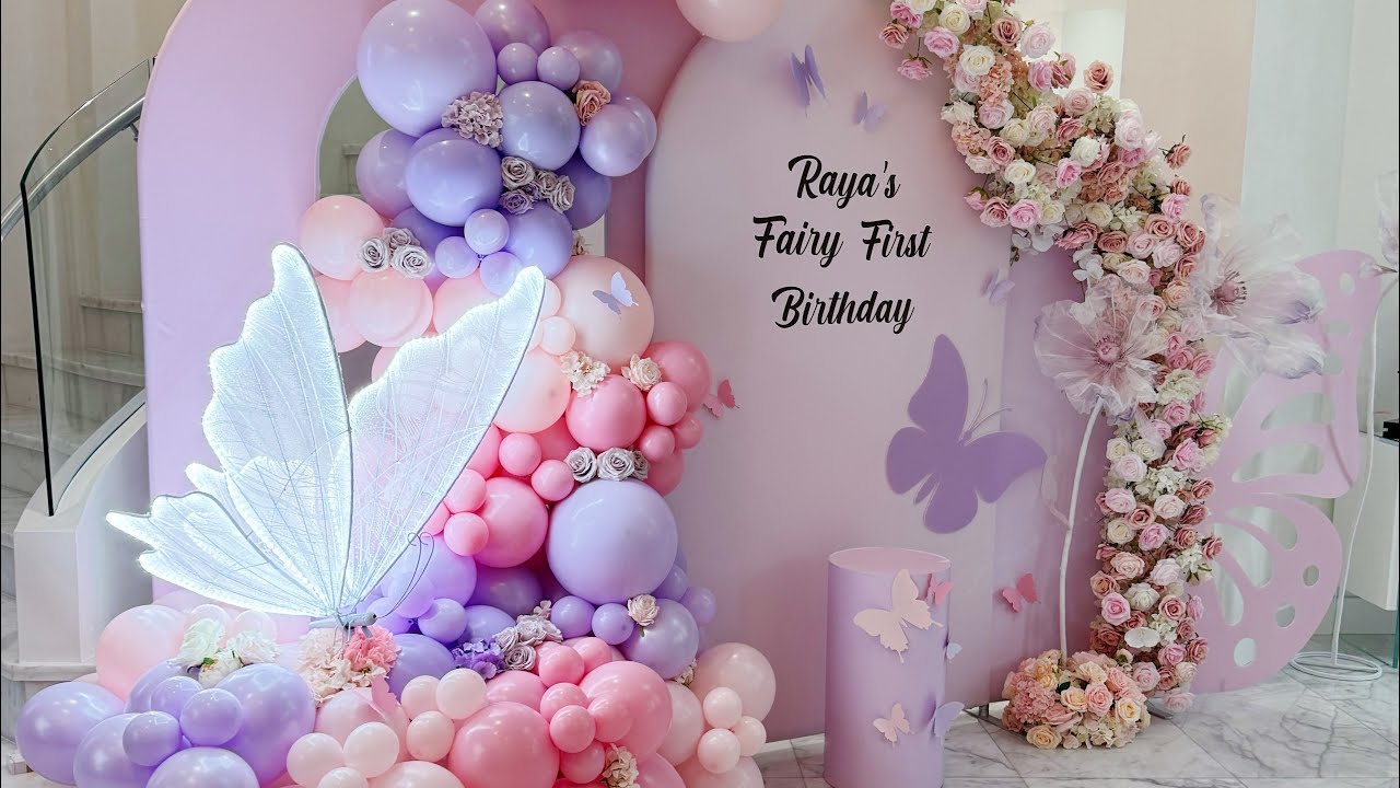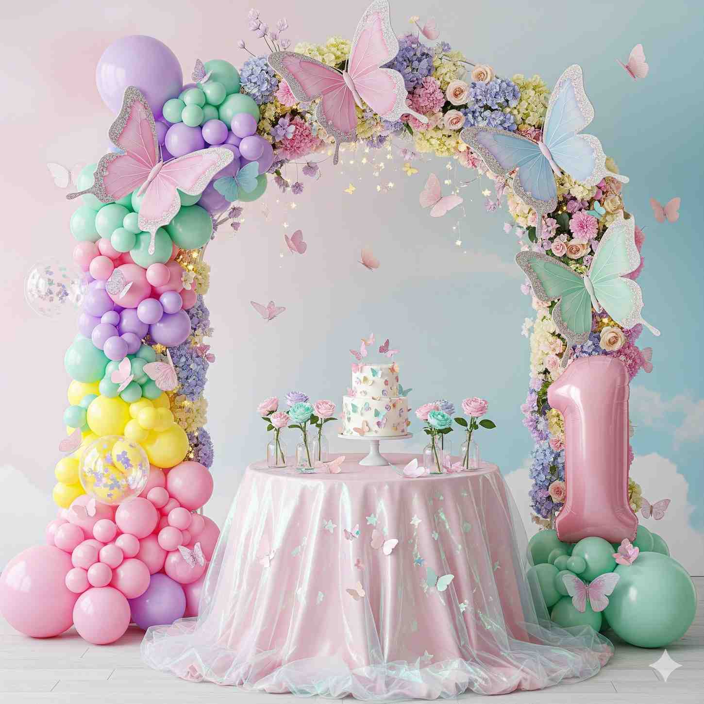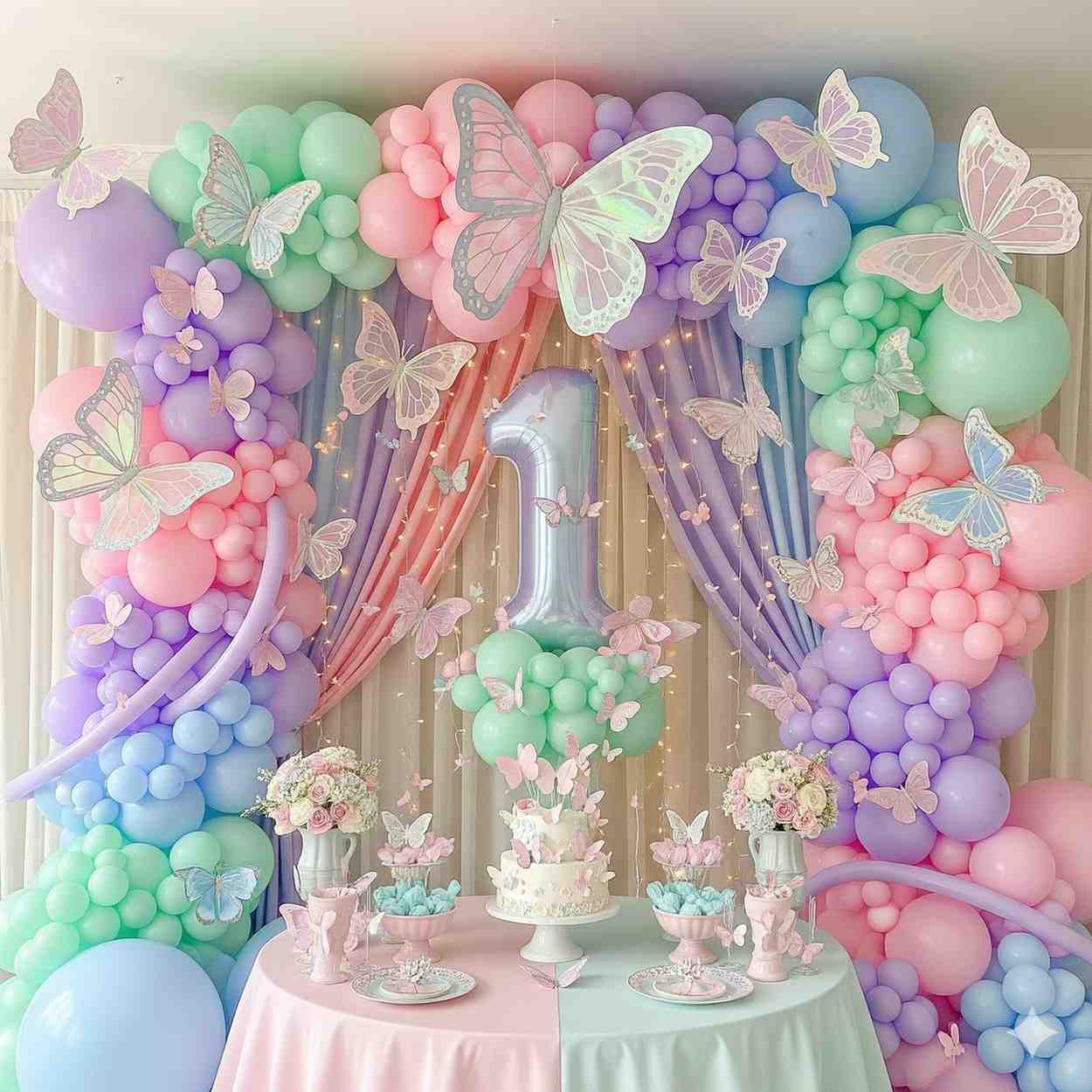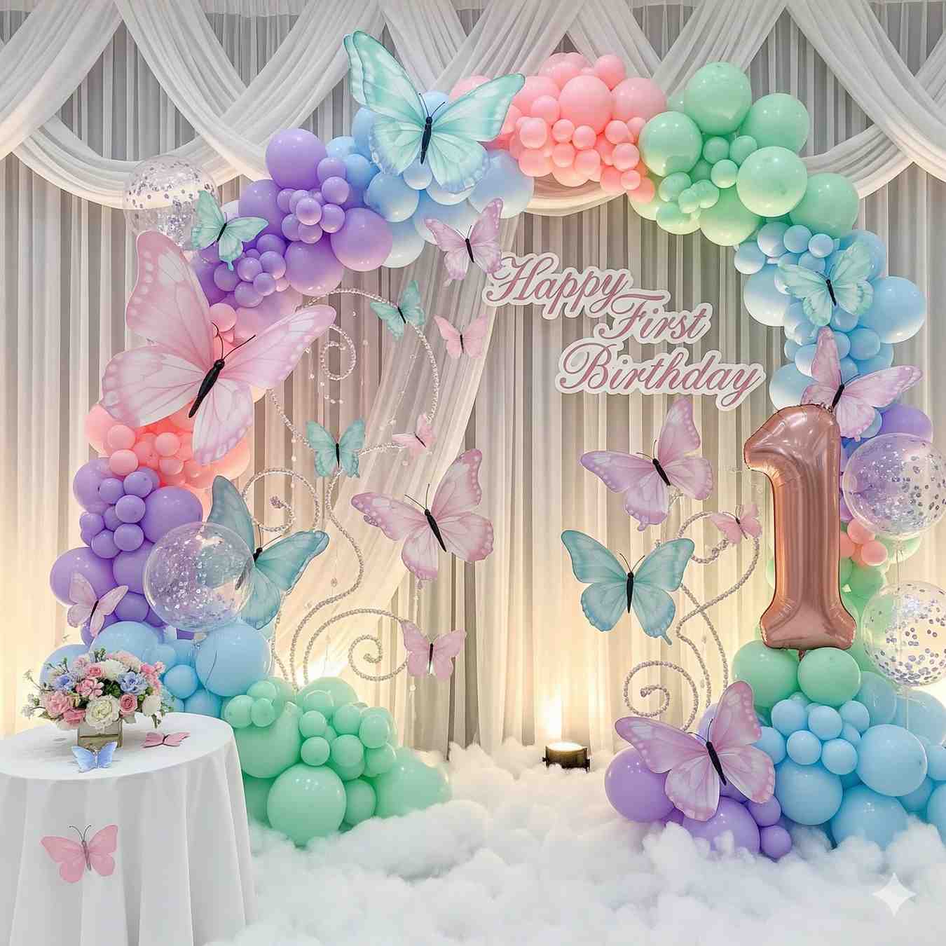 - At the heart of the décor is a stunning balloon arch, adorned with pastel pink and purple balloons. Matching balloon pillars on the ground complement the theme, while gleaming letter foil balloons beautifully read “One” above them. The backdrop has delicate white net curtains with twinkling star LED lights. A charming “Happy Birthday” banner in soft pink adds a touch of sweetness. To complete the enchantment, the entire setup is adorned with graceful rose gold butterflies. Plan an adorable birthday surprise for your baby girl with it.