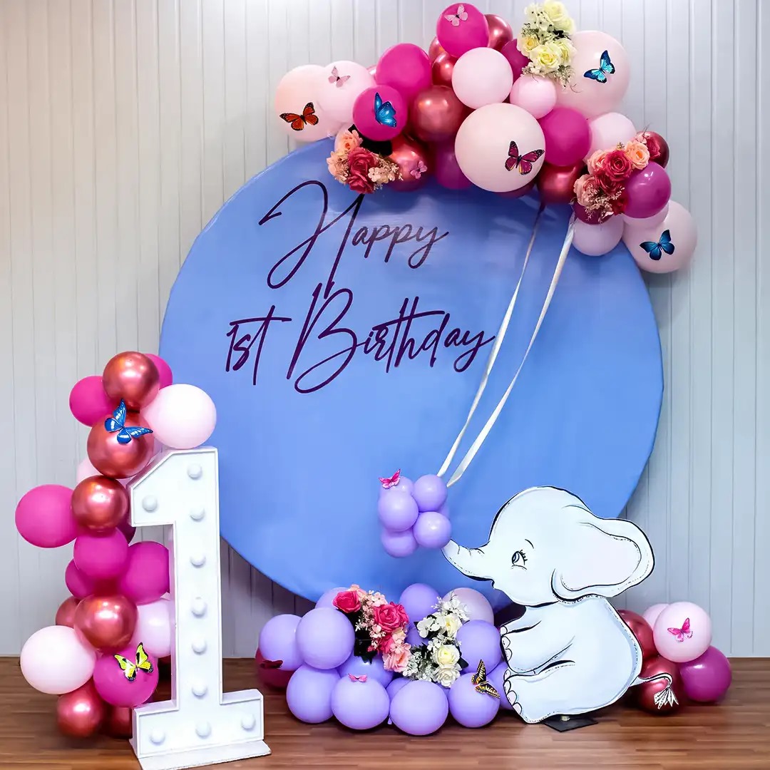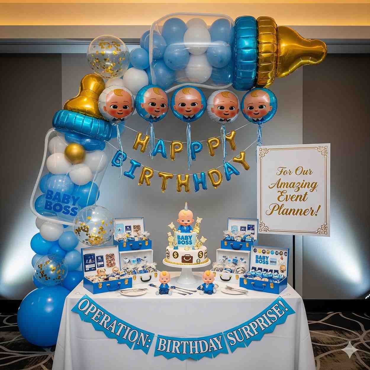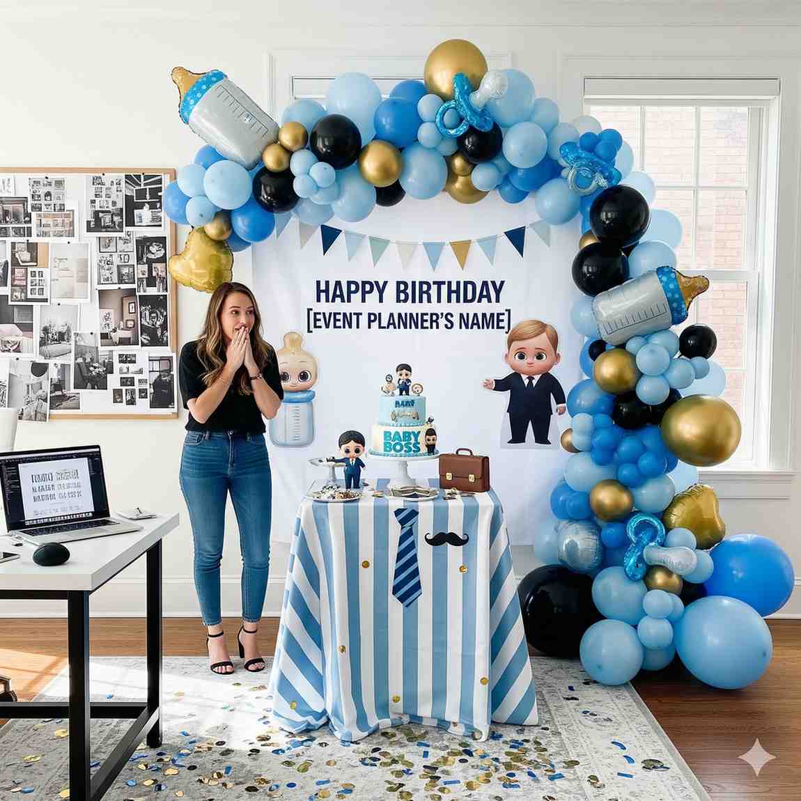Imagine blue curtains adorned with “HBD” letter foil balloons covering the wall. A balloon arch in blue, white, and black adds a stylish flair. Boss Baby-themed balloons and cutouts are decorated all around, while twinkling fairy lights create a magical ambiance. We will customize the numeric foil balloon to add a personal touch. The floor around is covered with loose balloons.