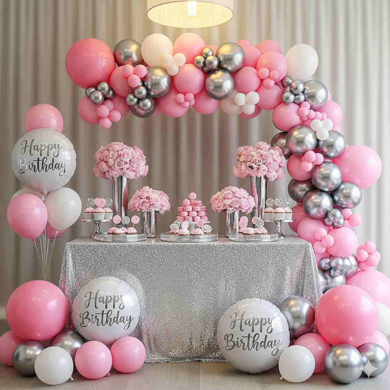 - The decor features a balloon arch that is designed using pastel pink, white and magenta coloured balloons. Silver frill curtains, confetti balloons, pink rosettes, fairy lights, ribbons and a “Happy Birthday” bunting beautify the look. Surprise your daughter/wife/sister/girlfriend or any loved one with this elegant decoration at home.