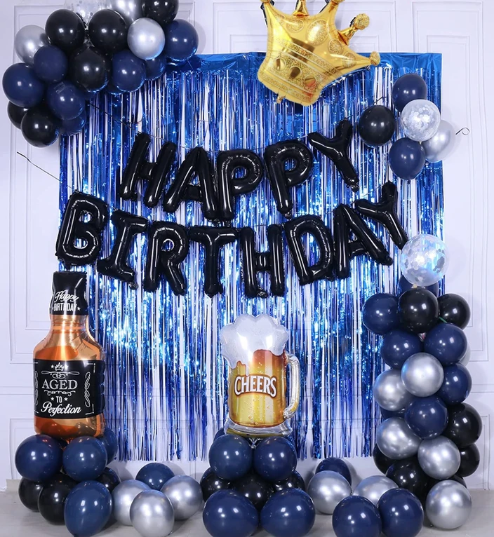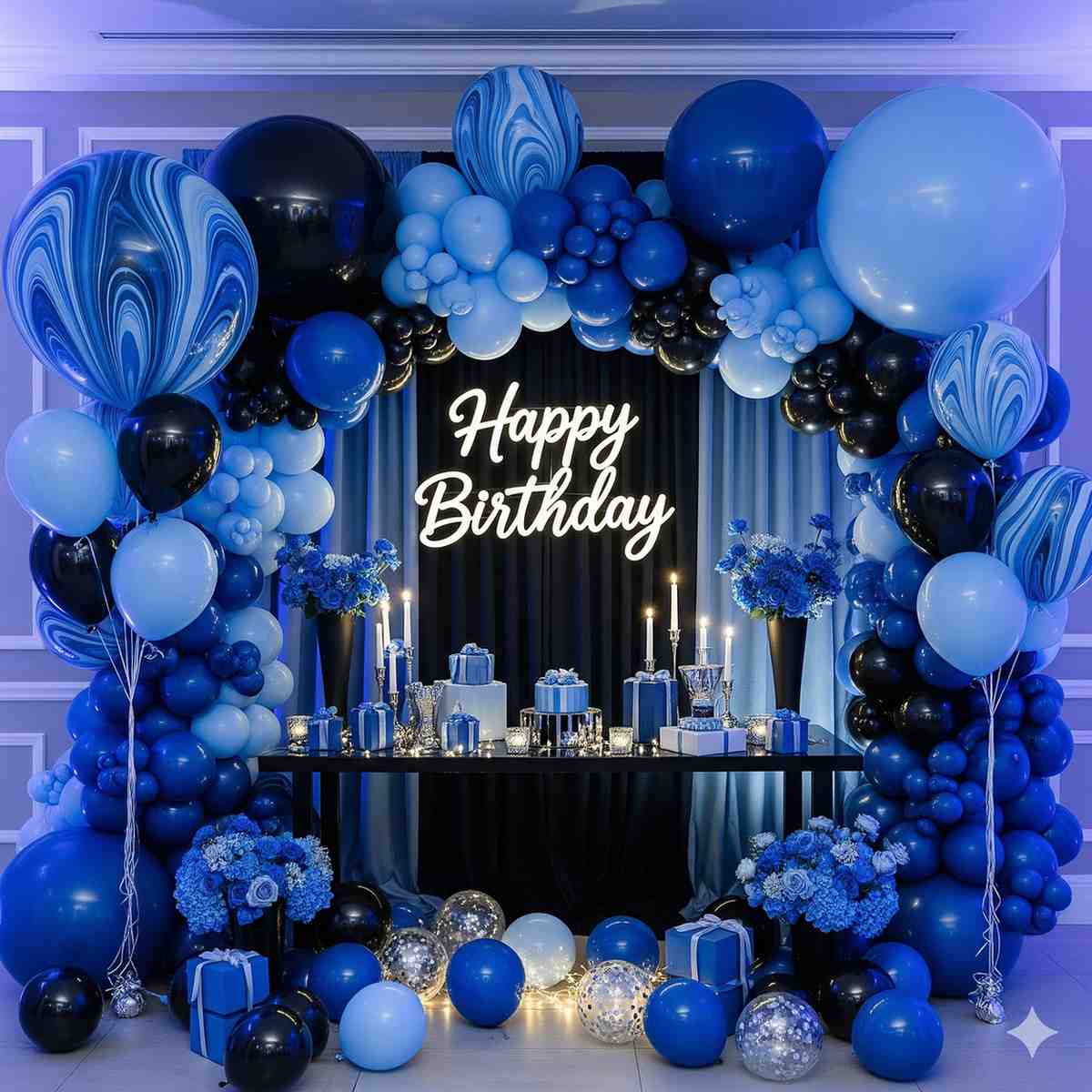 The ceiling is adorned with balloons and ribbons, dancing in the air with joy. On the wall, “Happy Birthday” shines brightly and is written using letter foil balloons. The bed becomes the centrepiece, crowned with a bouquet of number balloons, each digit customized to fit your celebration perfectly. To complete the scene, we have scattered loose balloons across the bed and floor. This setup is ideal for surprising your boyfriend, husband, dad, brother, friend, or any loved one on their special day. Choose it for anyone who likes this colour theme.
