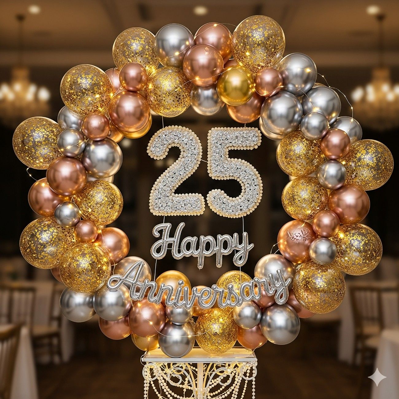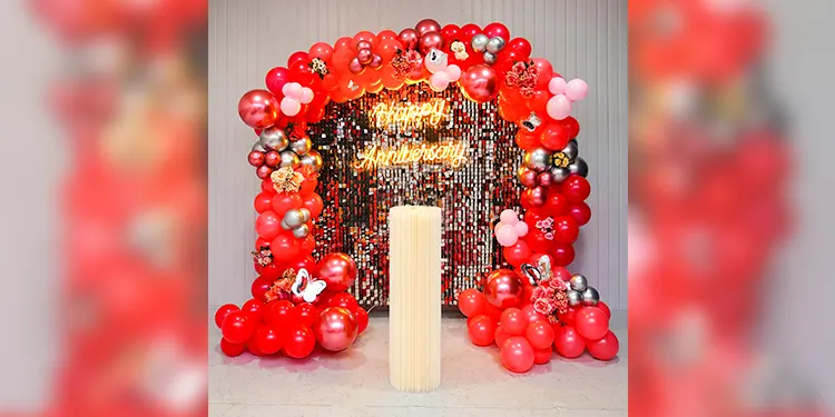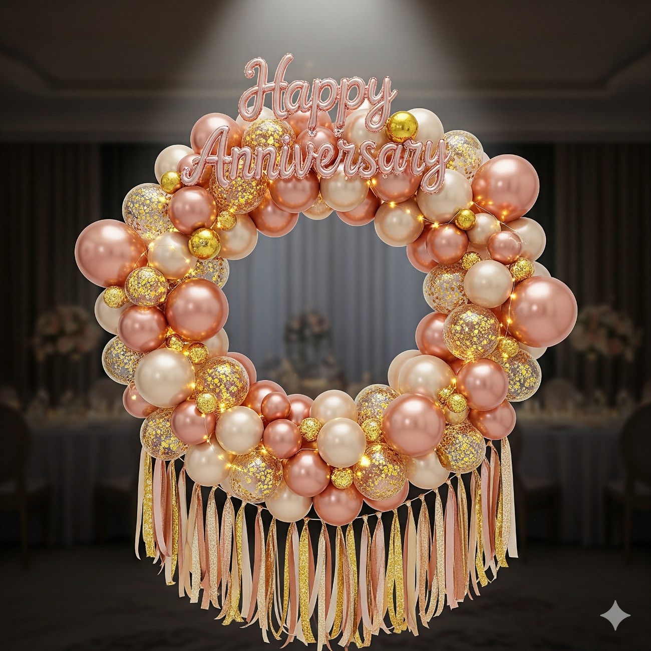 - We’ll decorate the party place with a circular ring backdrop adorned with a balloon arch. The arch will be filled with white, golden, and rose gold balloons arranged beautifully. We’ll also add multicoloured flowers to enhance the look and artificial palm leaves for a touch of nature. Completing the setup will be 4D balloons and a “Happy Anniversary” neon light. Simply book this glittering anniversary ring decoration online from here. We will decorate your location anywhere in Delhi & NCR.