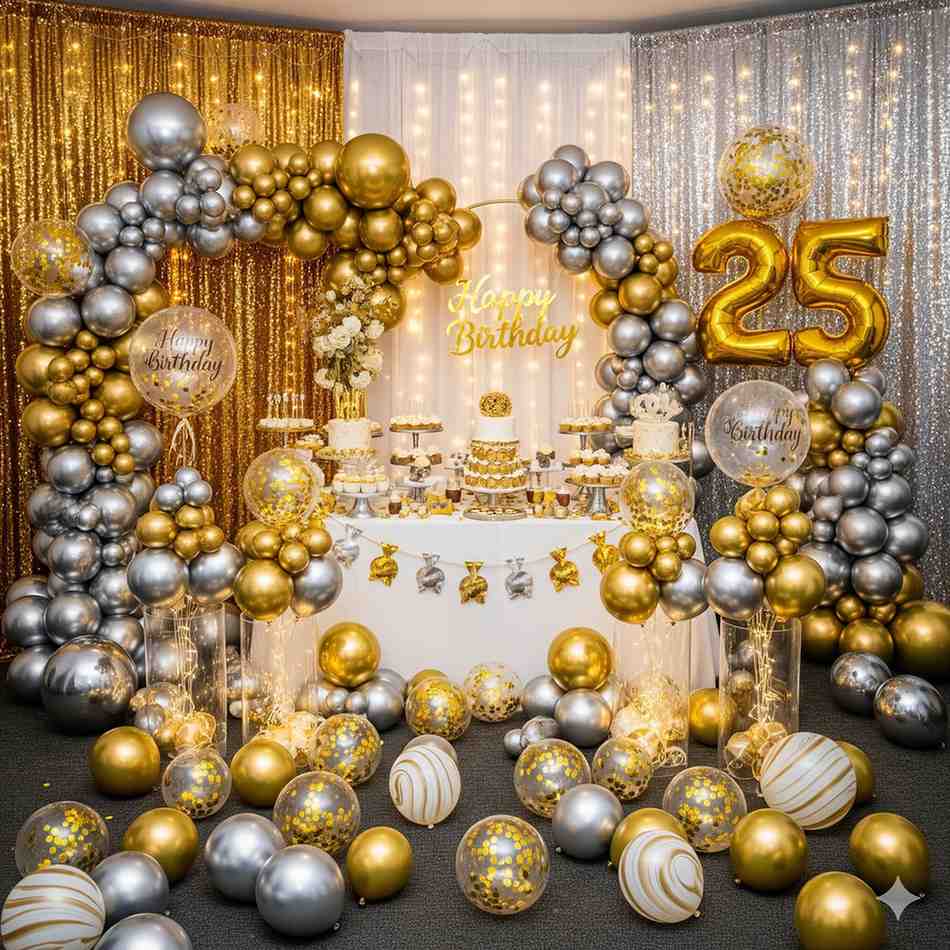 Simply book this gold and silver birthday room decoration online from here. We provide this balloon decor service all around Delhi & NCR.
