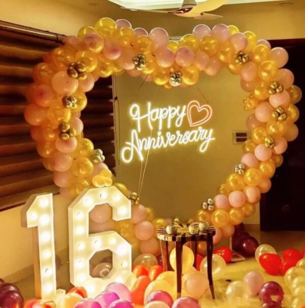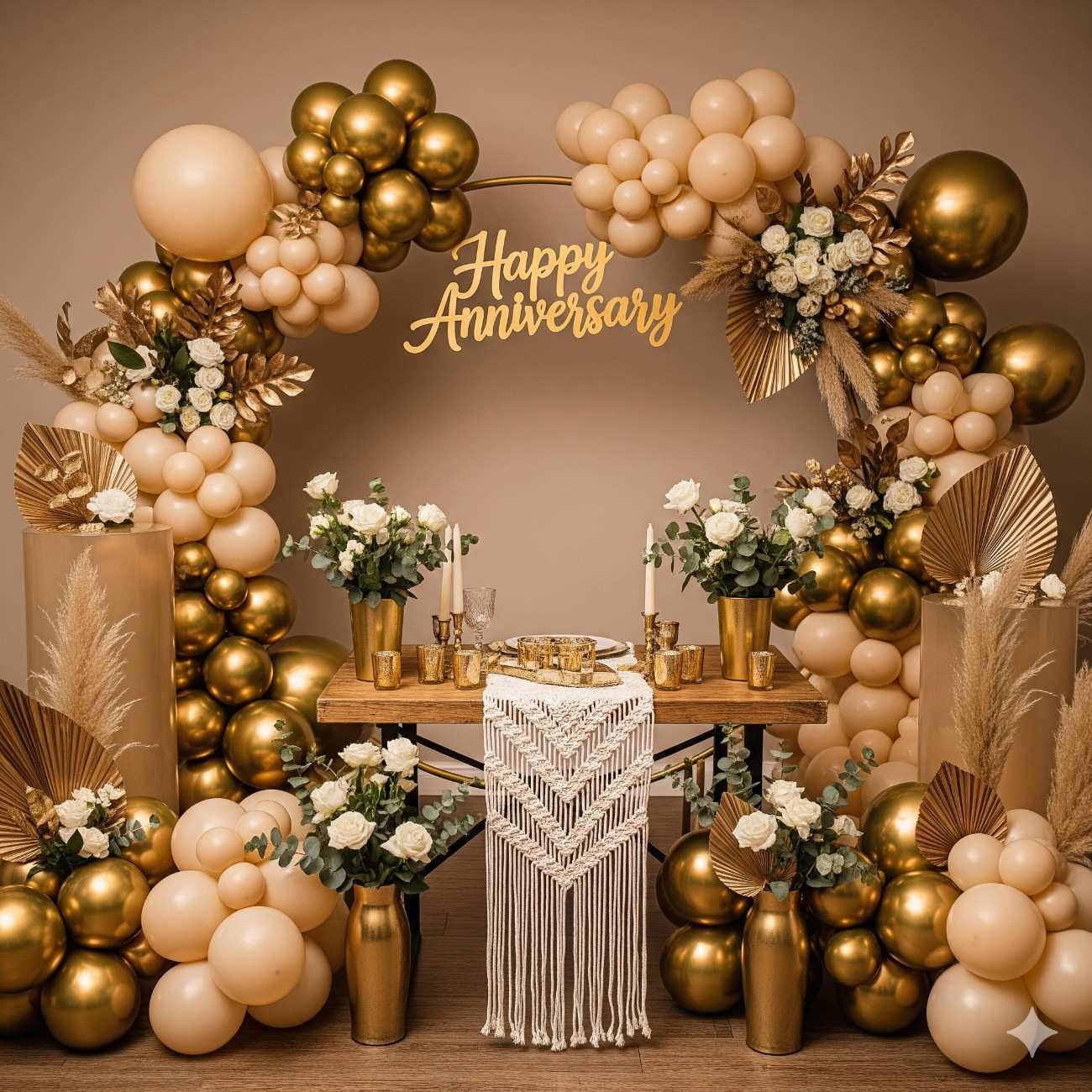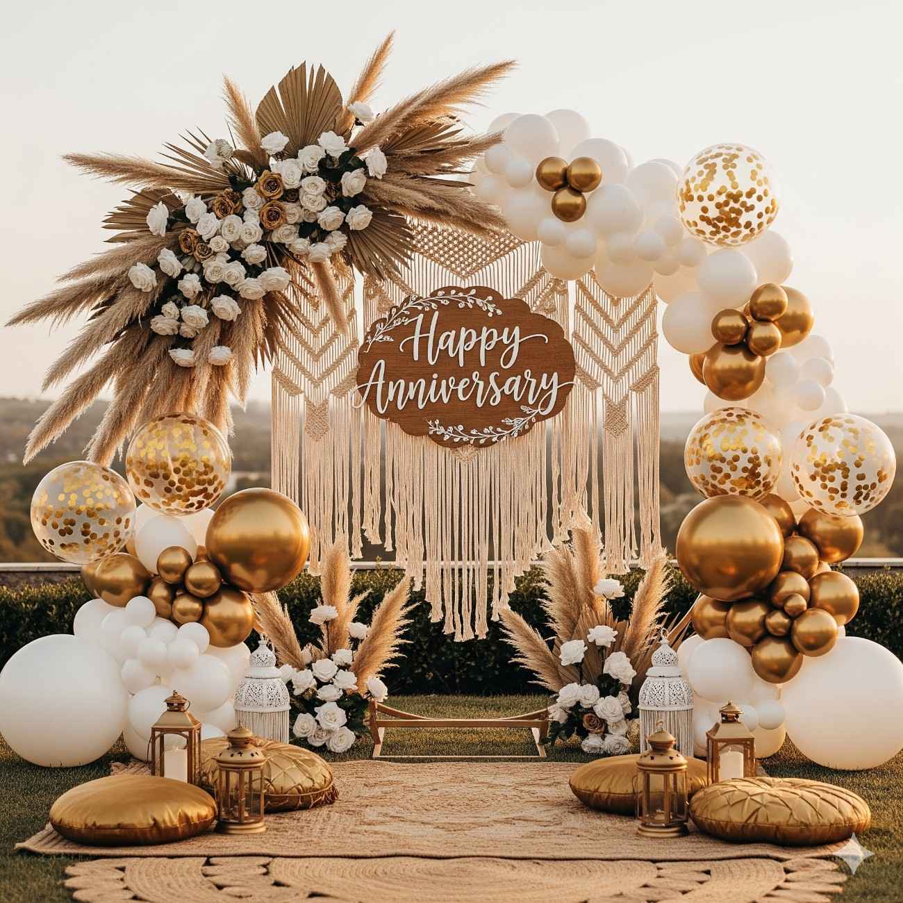 With a stunning circular ring backdrop adorned with a balloon arch in white, peach, and golden hues, the decor sets the perfect stage for your celebration. The decor also features a “Happy Anniversary” neon signage, green palm leaves, white floral strings, confetti balloons, bubble balloons, fairy lights, and a numeric LED light marquee that can be customized. The floor around is covered with loose balloons. This elegant decor theme is perfect for milestone anniversary celebrations like 30th, 40th, 50th, and beyond. Click beautiful pictures beside this backdrop, capturing every precious moment. Simply book this golden boho theme anniversary ring decor online from here. We will decorate your location anywhere in Delhi & NCR.