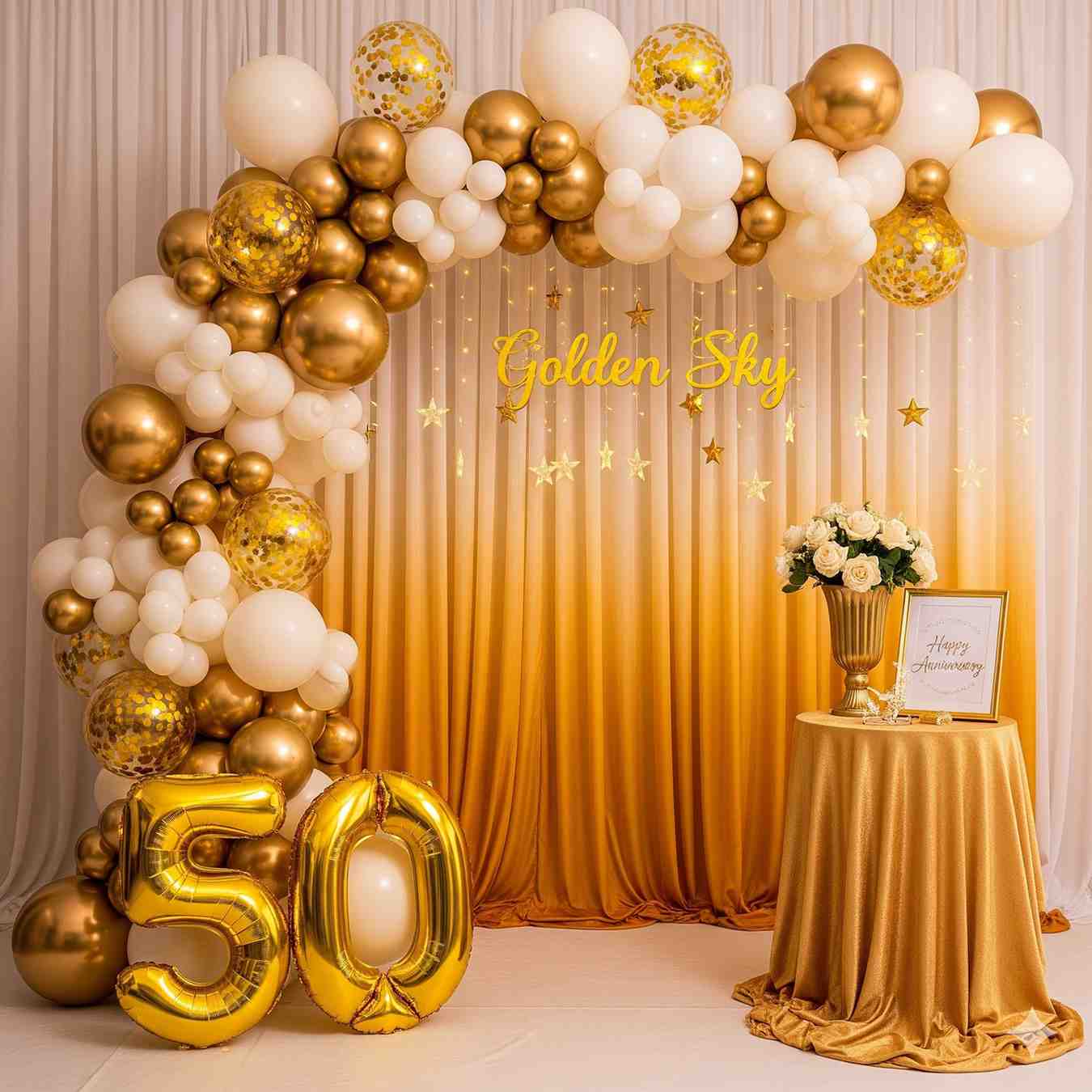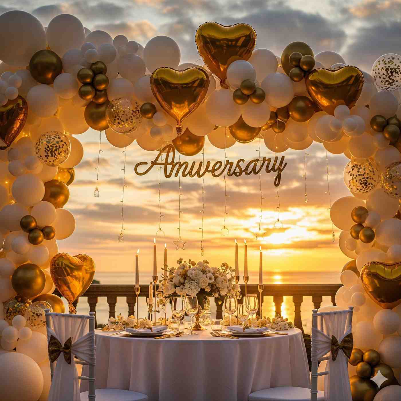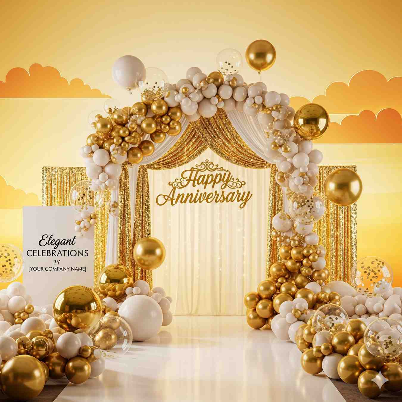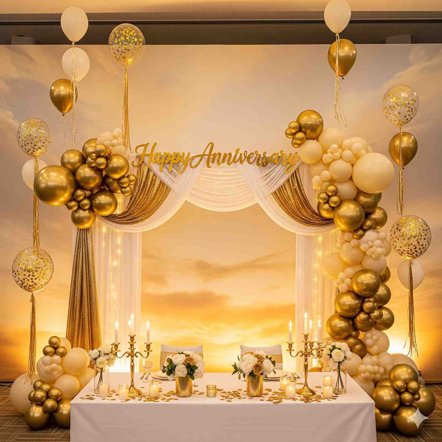 The decor includes light blue and golden frill curtains, adorned with a”Happy Anniversary” bunting and a balloon arch. We have designed this arch using blue, golden and white coloured balloons. This setup also has 3D butterflies that look very cute. Choose this decor theme to surprise your husband/wife. You can easily book this golden skyline anniversary decoration online from here. We will decorate your location anywhere in Delhi & NCR.