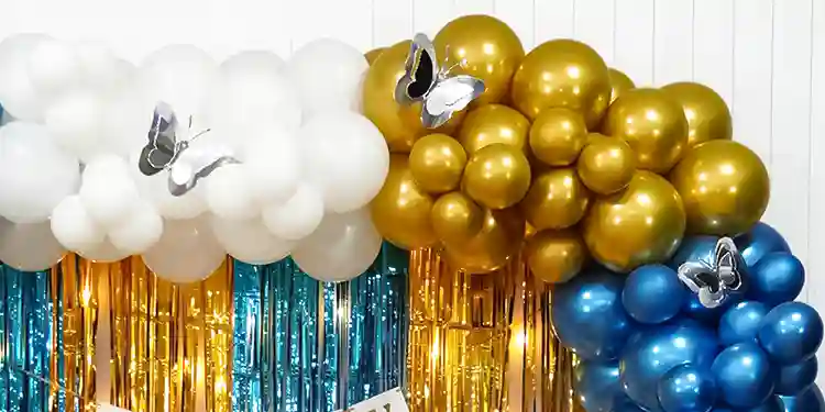 Arch of 200 Balloons of Colour 60 Blue Chrome, 60 Golden Chrome and 60 Latex White Balloons