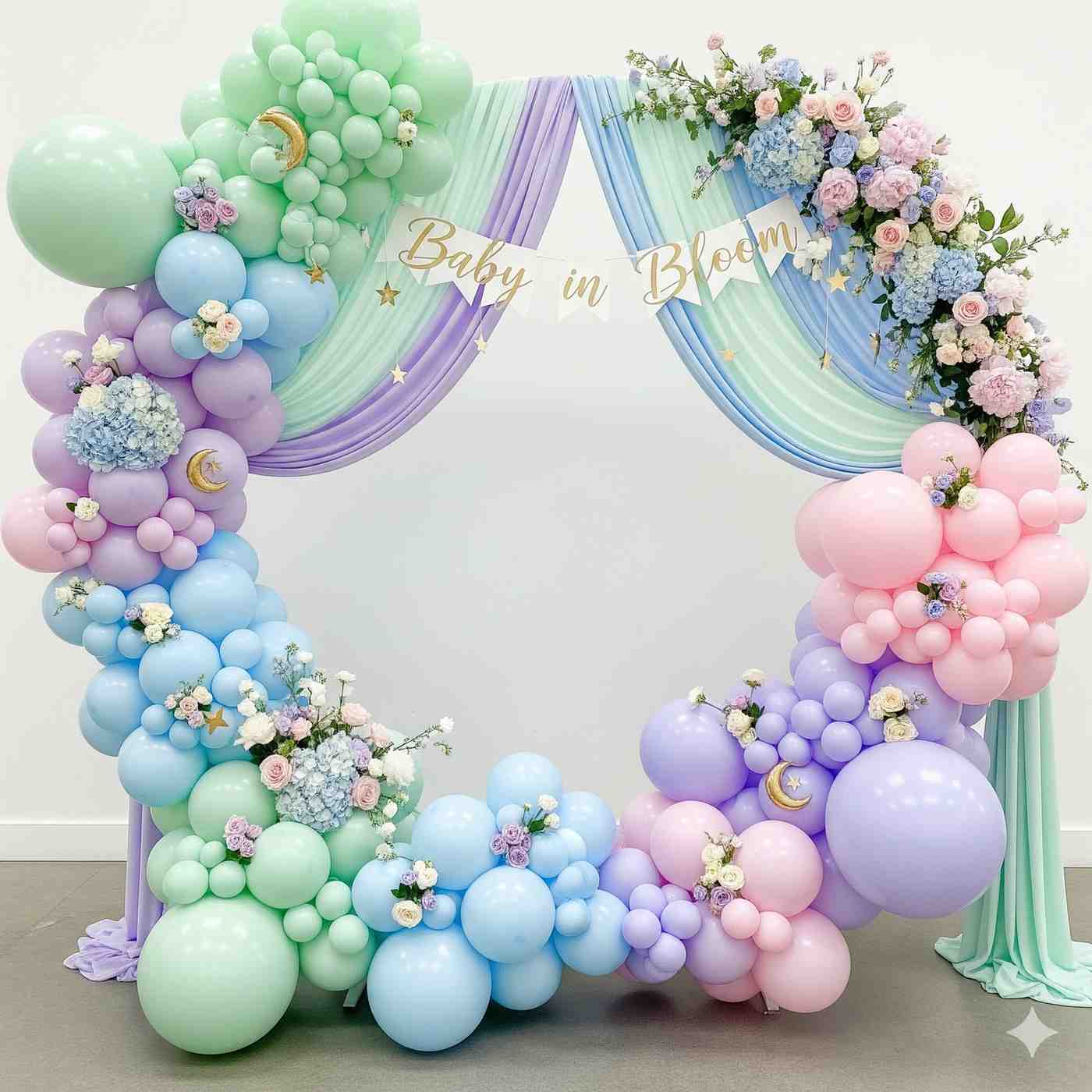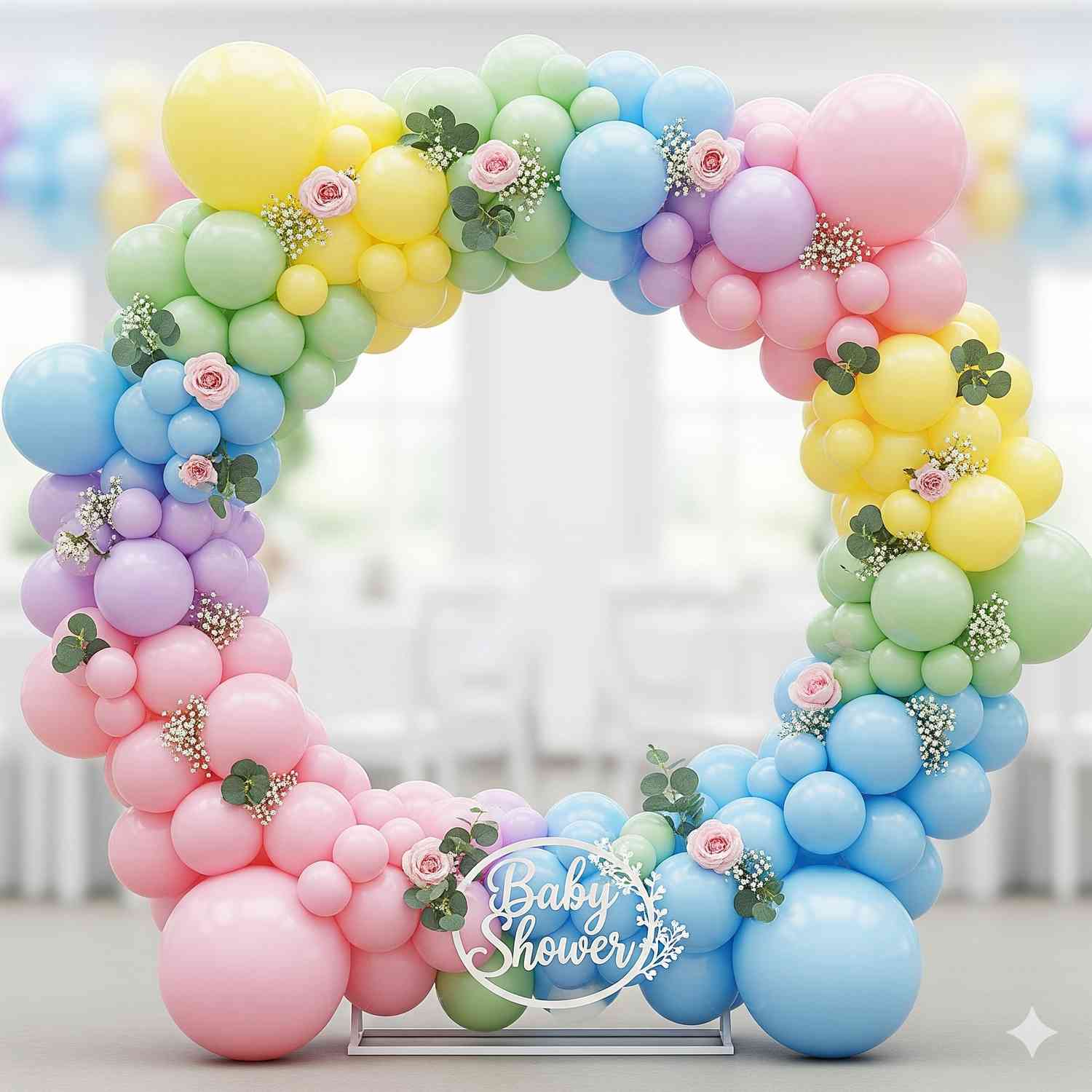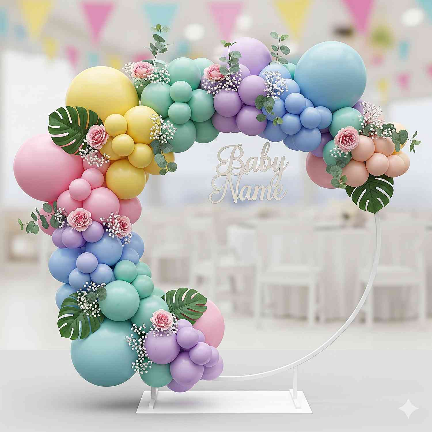 - The decor theme features a delightful blend of pink, purple, and rose gold hues. At the heart of this setup lies a circular ring frame adorned with bunches of pastel pink and purple balloons. It is then decorated with rose gold chrome, confetti and macaron balloons that enhance the look. We have also used some green palm leaves in between this setup. Amidst this enchanting backdrop hangs a charming “Baby Shower” bunting, that completes the look. This beautiful decor brings along a sense of serenity and warmth.