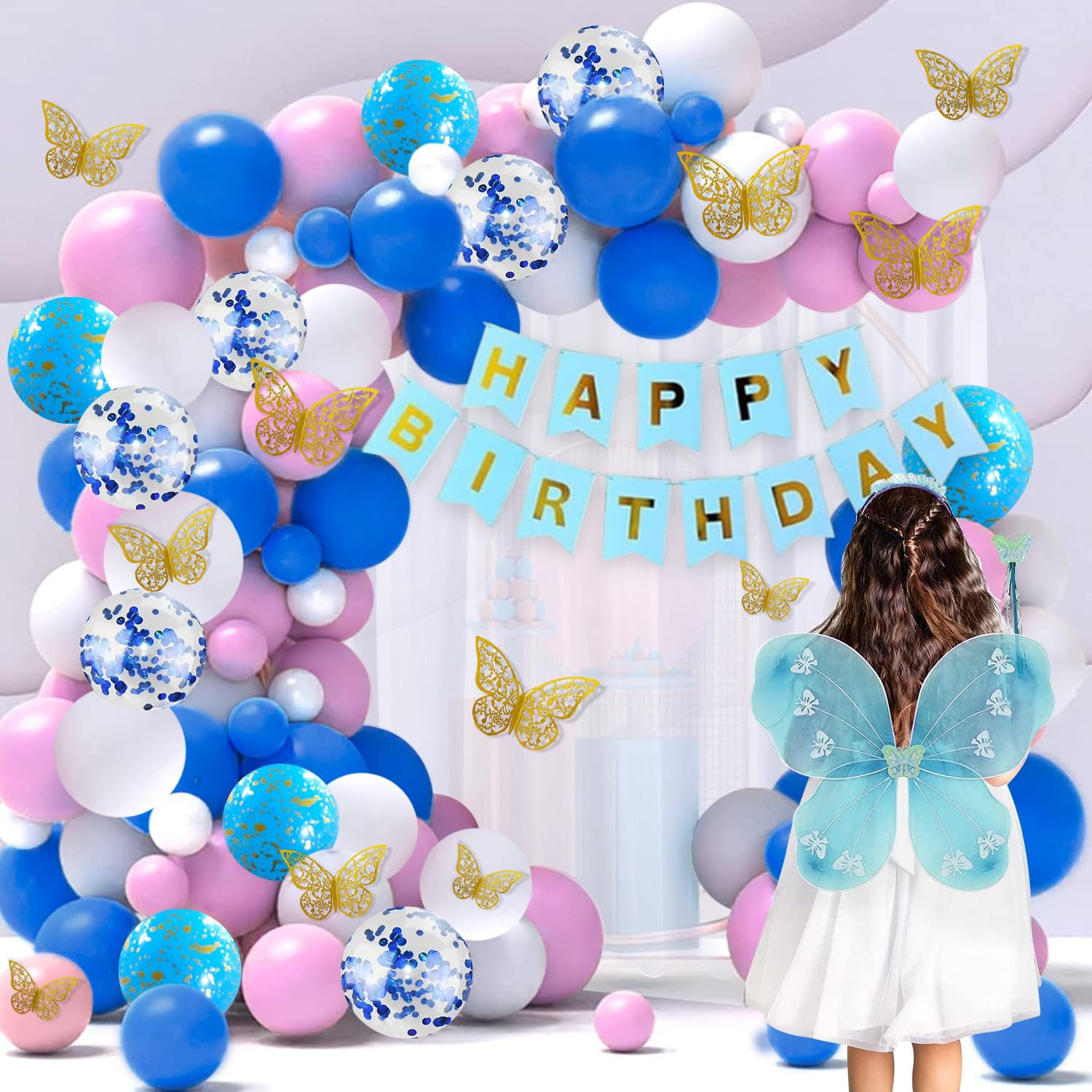 - The exquisite setup includes a white net backdrop adorned with pixel fairy lights. We have decorated “Happy Birthday” letter foil balloons in the centre. A pretty purple balloon arch surrounds it from 2 sides. This arch is made using dark purple, light purple, printed polka, pastel and chrome balloons. To elevate the magic, delicate 3D butterflies dance between the beautiful orchid strings. This beguiling decor idea is perfect for your wife’s, daughter’s, mother’s, sister’s or girlfriend’s birthday. Simply book this purple butterfly magic birthday decoration online from here.