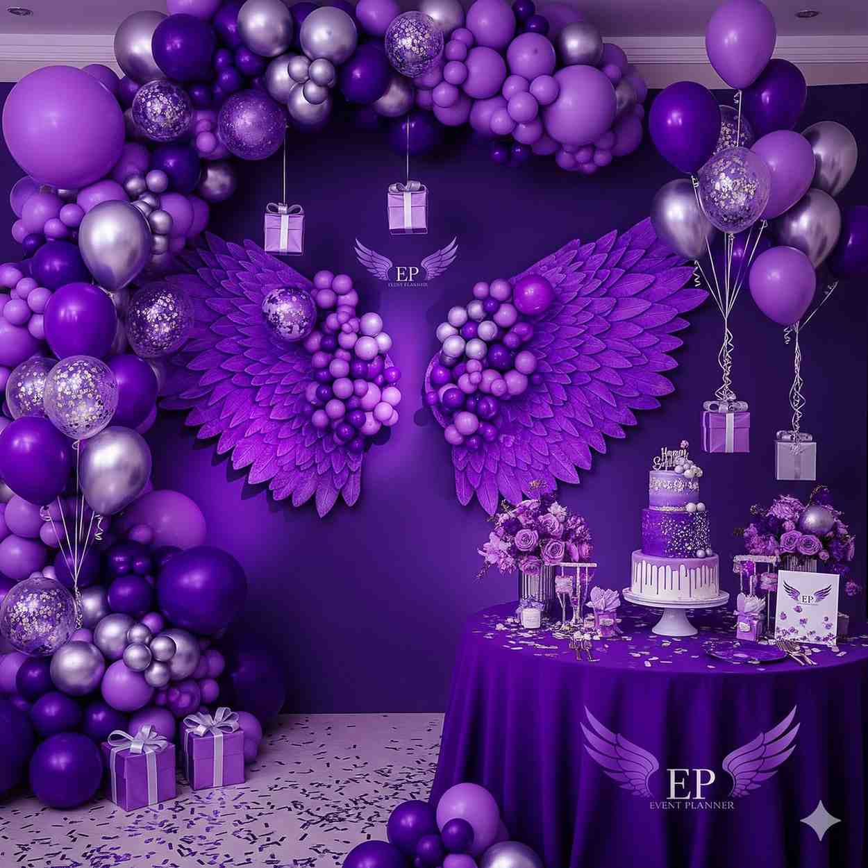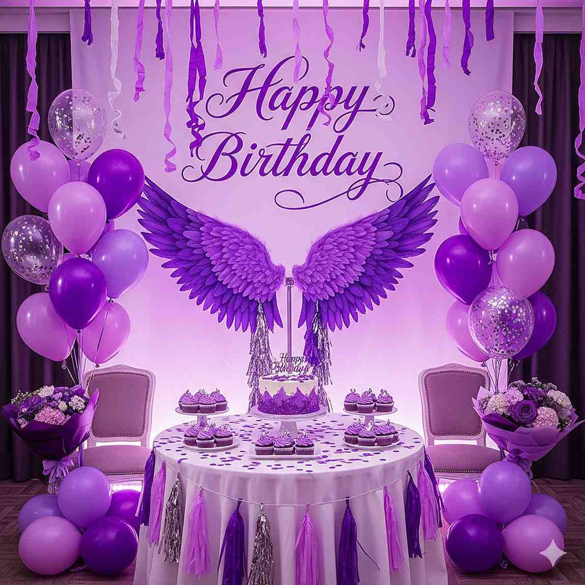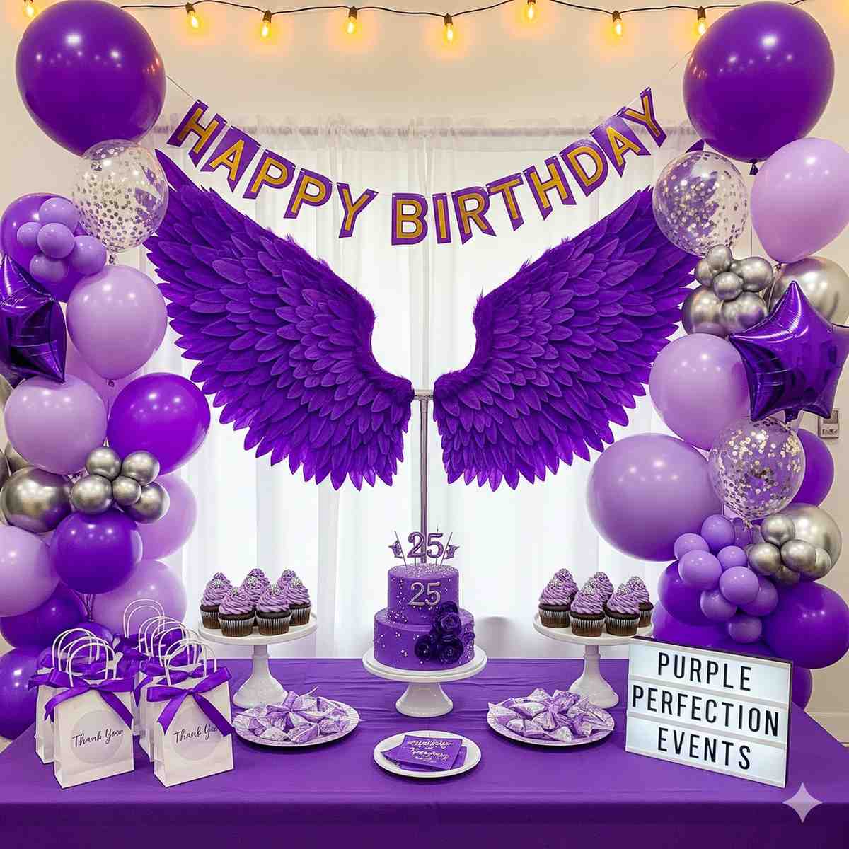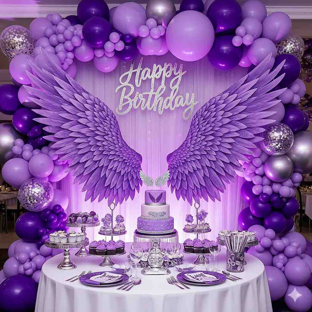 - Step into a world of enchantment with a birthday decoration adorned in shades of purple.