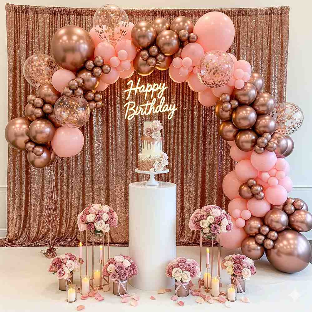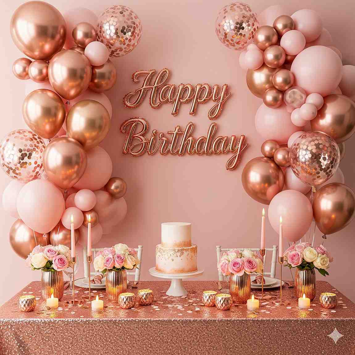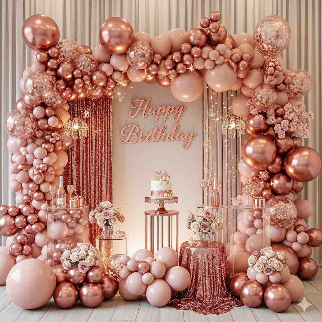- Celebrate your loved one’s special day with an enchanting birthday decoration featuring dreamy rose gold balloons.