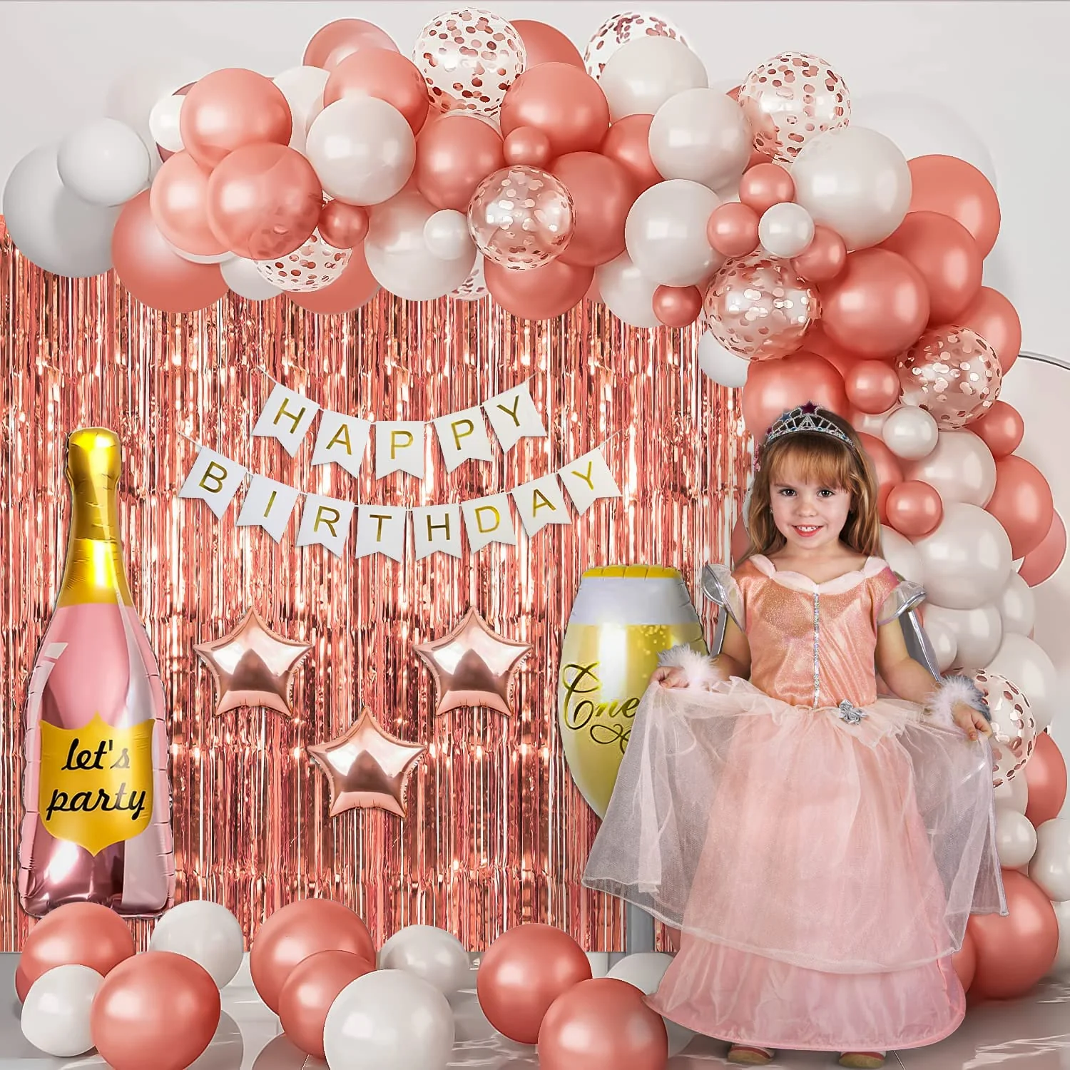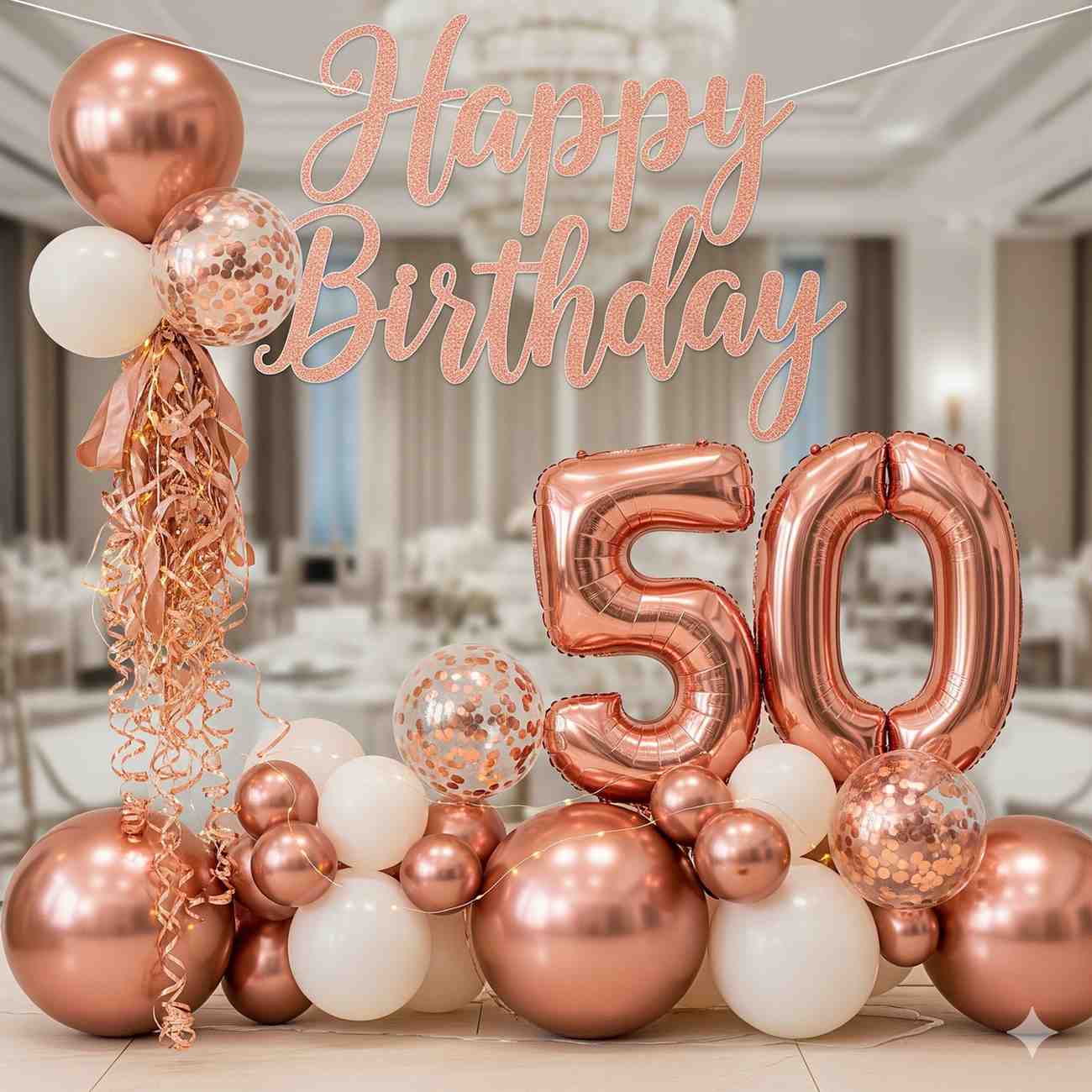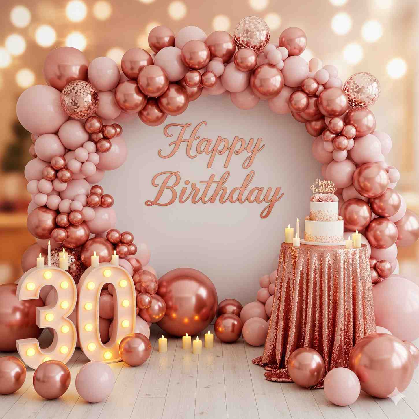 - Celebrate your loved one’s special day with an enchanting birthday decoration featuring dreamy rose gold balloons.