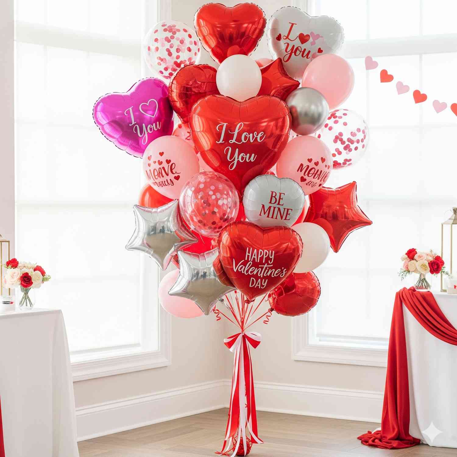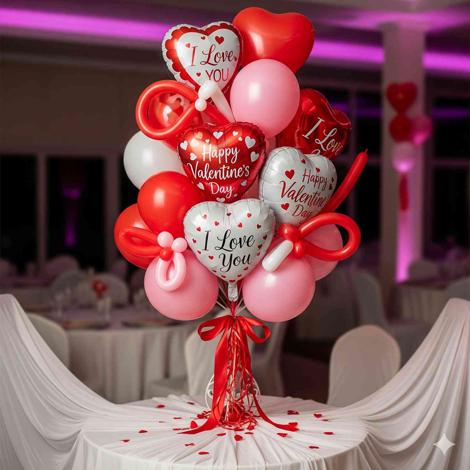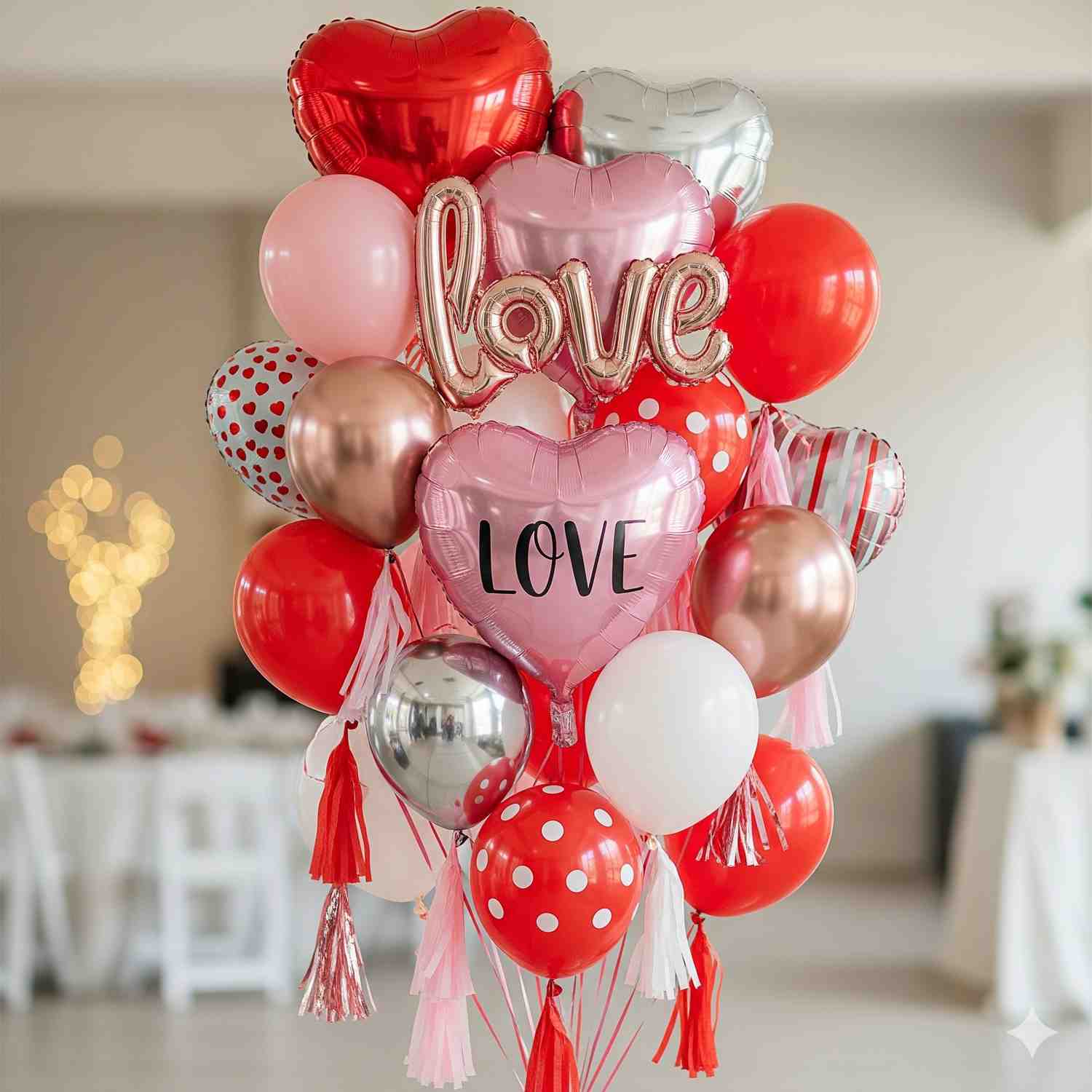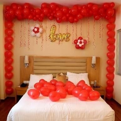 - Look at this wall adorned with red, maroon and pink balloon bunches. Together they make a beautiful heart-shaped backdrop. Their vibrant hue will illuminate your room. Gracefully adorned with “love” letter foil balloons, this decor looks very aesthetic. Surprise your girlfriend/boyfriend with the most romantic decor. Choose this theme for occasions like anniversaries, Valentine’s Day, romantic proposals and more. You can easily book this sweet-heart wall balloon decoration online from here. We will decorate your location anywhere in Delhi, Mumbai, Bangalore, Kolkata, Pune, Jaipur, Ahmedabad, Hyderabad, Lucknow, Indore and more.