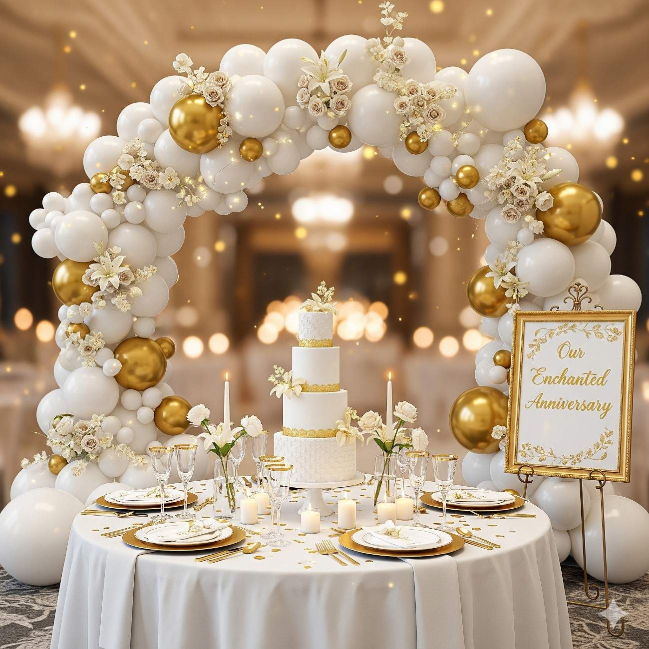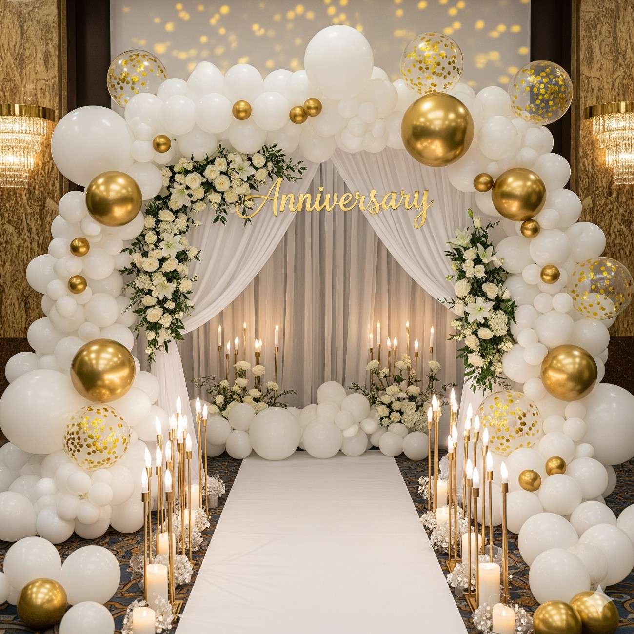 The decor theme features a stunning three-sided balloon arch, crafted from a mix of golden and white chrome balloons, golden confetti balloons, white macron balloons, and golden palm leaves. The backdrop wall has an elegant white net, golden frill curtains and twinkling fairy lights. They together read a “Happy Anniversary” message that is written using letter-foil balloons. This charming decor can be a thoughtful surprise for your beloved husband or wife.